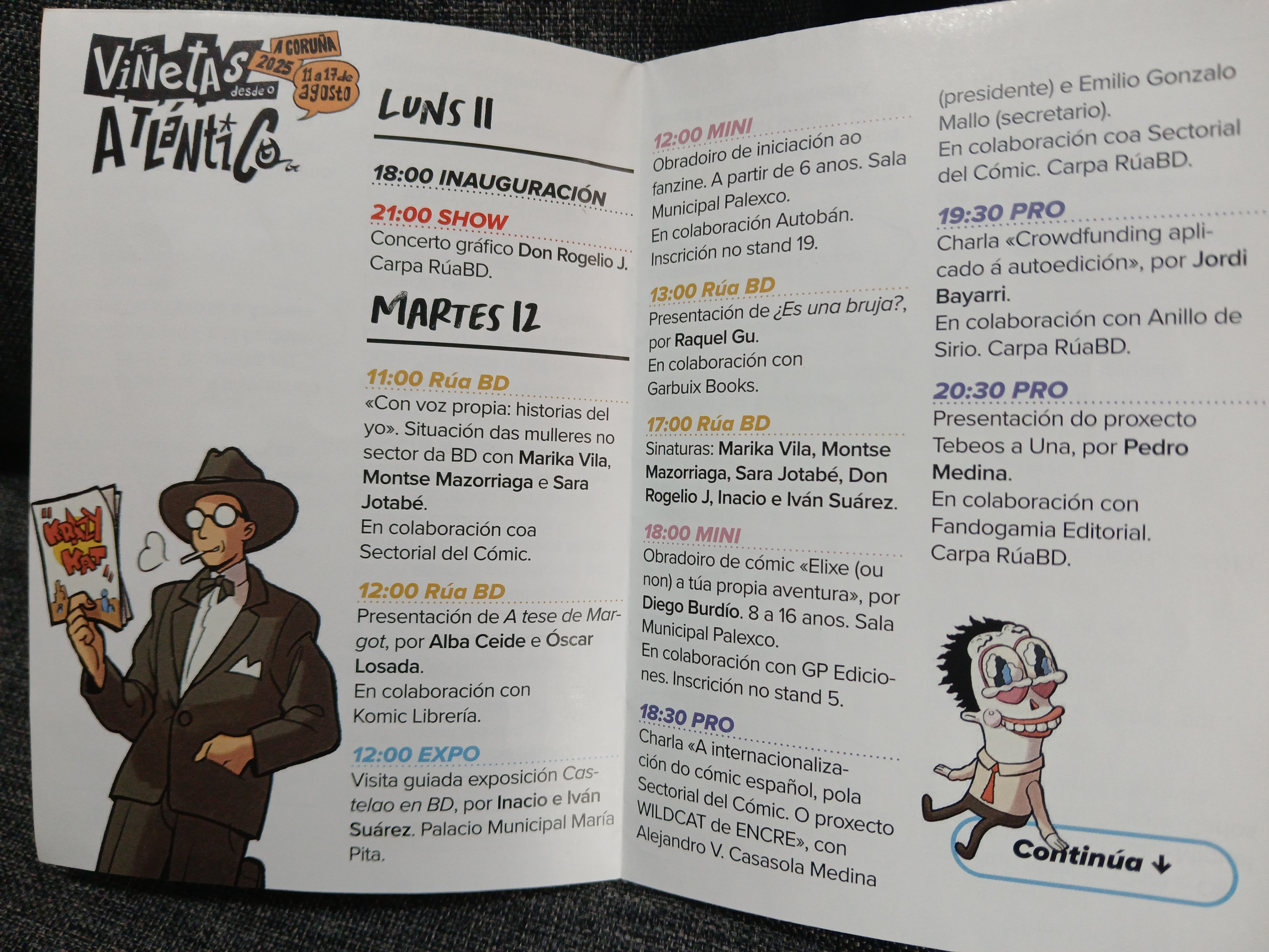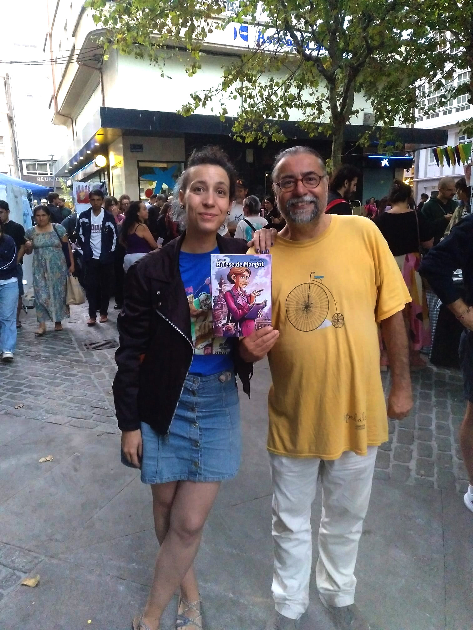 The presentation of the current edition took place at the Vinetas desde o Atlántico Comic Festival in A Coruña. Óscar and I gave a talk on Tuesday, August 12, sponsored by Librería Komic, where we introduced festival visitors to the historical figure of Margot Sponer and discussed our collaborative work on her story.
