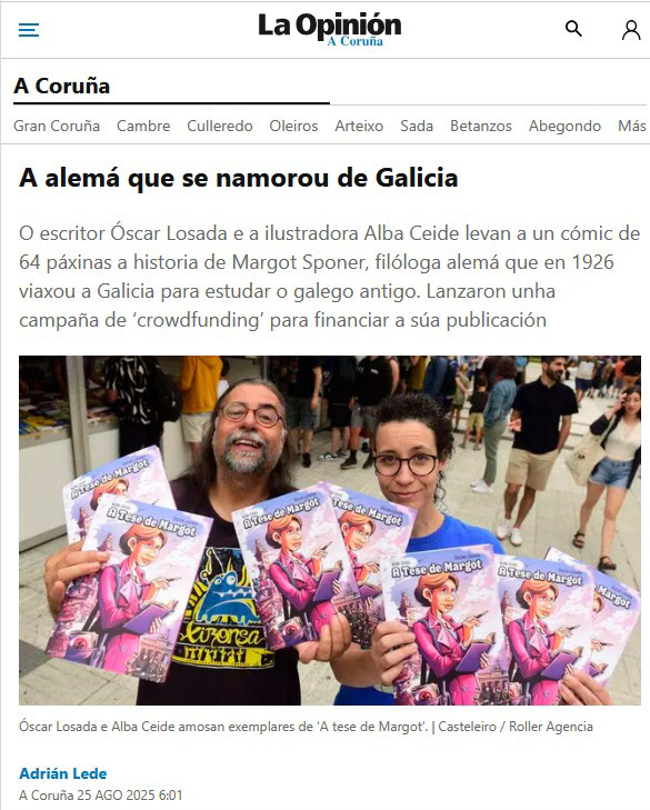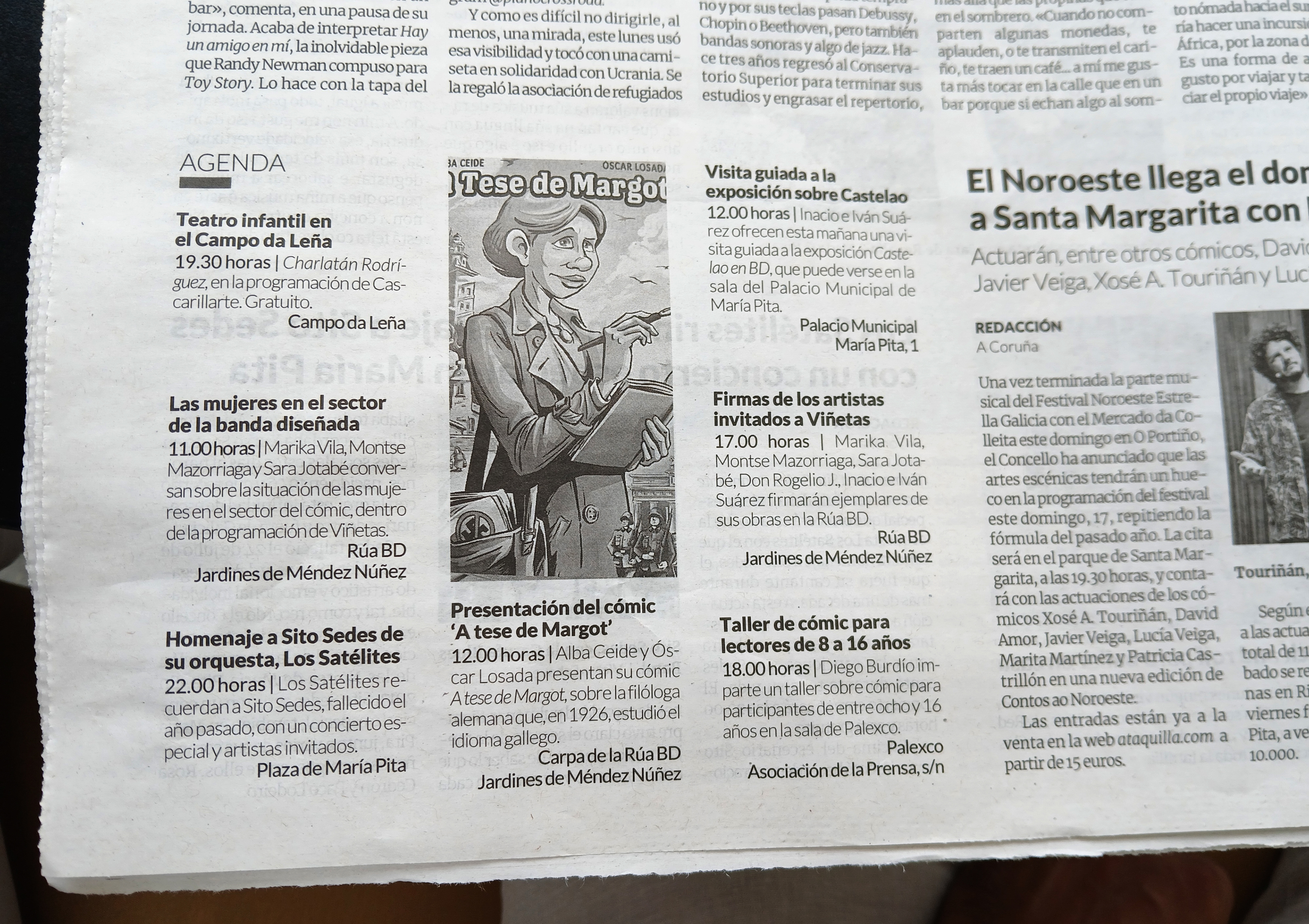 "A Tese de Margot" (The Thesis of Margot) is a biographical graphic novel with feminist themes and historical context which was published in August 2025 during the Vinetas desde o Atlántico Festival in A Coruña.