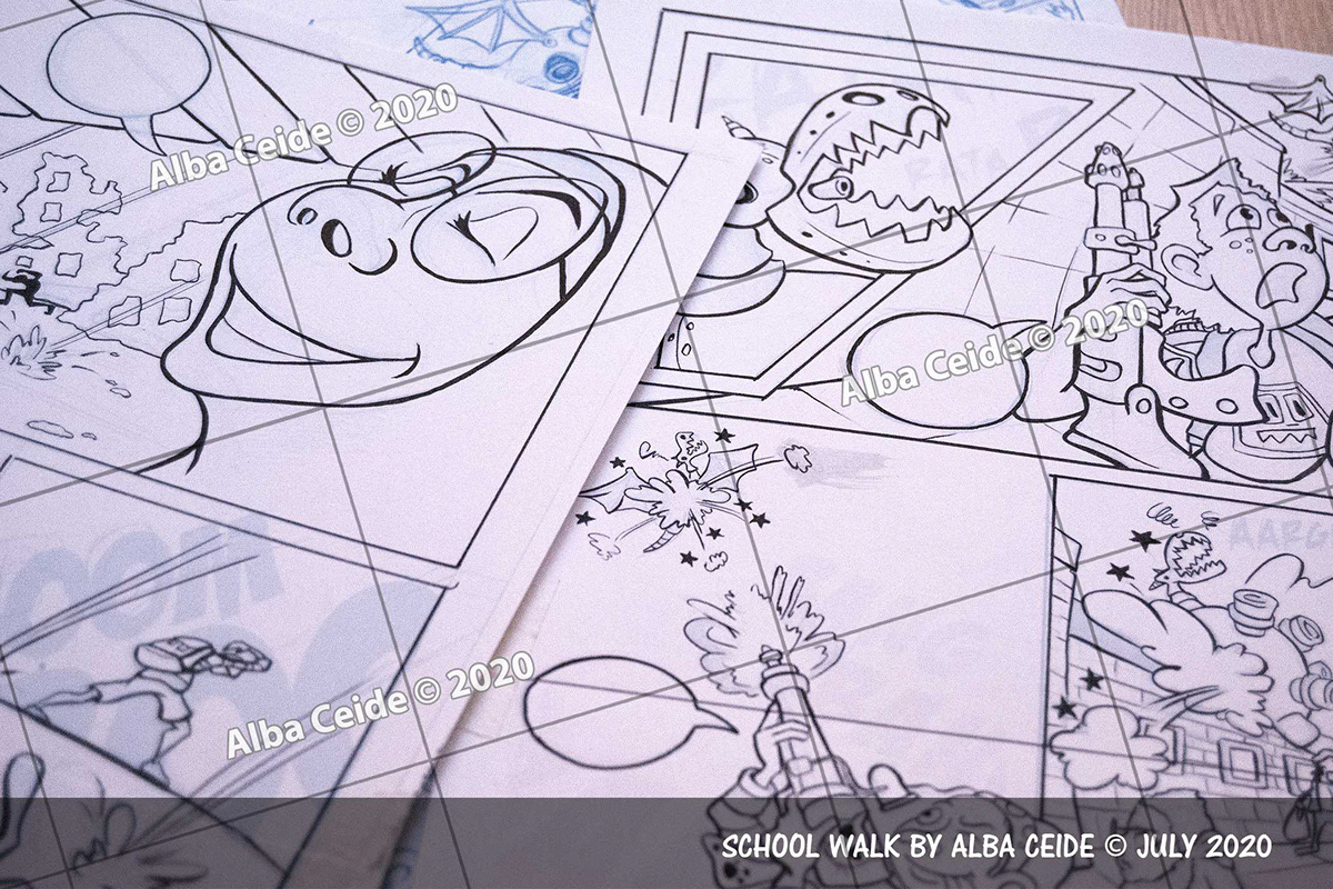 This is my comic, School Walk, a short story about children and their journey to school. Through this narrative, I aim to comment on the Syrian conflict and the impact of war on childhood. The dialogue on the second page features verses from the poem "Recuerdo Infantil" by Antonio Machado (Soledades, 1903).